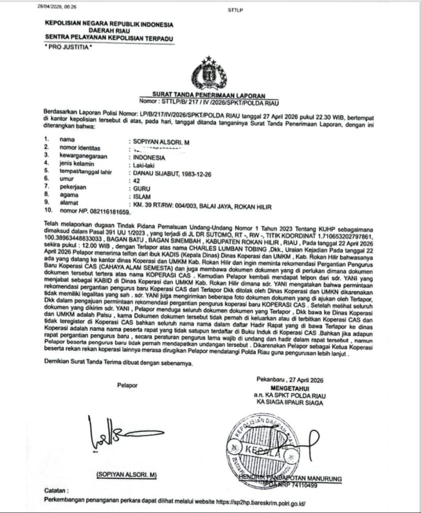 “Kronologi bermula pada 22 April 2026, saat pelapor menerima informasi dari Kepala Dinas Koperasi dan UMKM Kabupaten Rokan Hilir, terkait adanya pihak yang mengajukan permohonan rekomendasi pergantian pengurus Koperasi CAS. Pengajuan tersebut disertai sejumlah dokumen yang mengatasnamakan Koperasi CAS,” ucapnya.