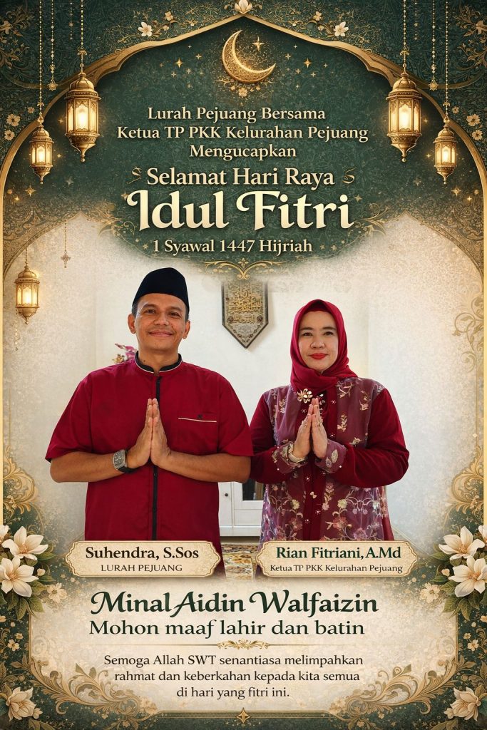 Lurah Pejuang, Suhendra, S.Sos., bersama Ketua Tim Penggerak PKK Kelurahan Pejuang, Rian Fitriani, A.Md., menyampaikan bahwa suasana Idul Fitri yang penuh kehangatan dan kebahagiaan diharapkan mampu menjaga nilai-nilai kebajikan yang telah ditempa selama bulan suci Ramadan.