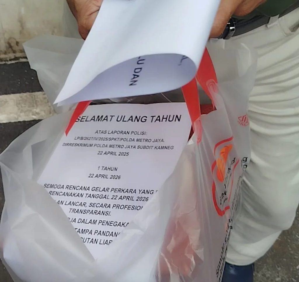 Adalah Suryono, atau yang dikenal sebagai “Ketua Aing”, yang menarik perhatian. Pada 22 April 2026, ia membawa kue ulang tahun sebagai bentuk sindiran terhadap laporan polisi bernomor LP/B/2627/IV/2025/SPKT/Polda Metro Jaya yang genap berusia satu tahun tanpa kejelasan.